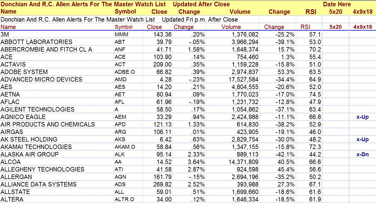 If a stock’s 4-day MA price crosses from below to above its 9-day moving average and then its 9-day moving average crosses above its 18-day moving average with a surge in volume, an alert is generated that reads, “AllenU,” meaning “R.C. Allen Up Alert.” On the other hand, if a stock’s 4-day MA price crosses from above to below its 9-day moving average and then its 9-day moving average crosses below its 18-day moving average with a surge in volume, an alert is generated that reads, “AllenD,” meaning “R.C. Allen Down Alert.” Similar alert signals are generated for the other moving average systems. If three alerts are generated simultaneously, they are all reported. For example, the report might read “AllenU 5x20U 10x20U.” The percent change in price for the day (%∆) is in column 5. The percent change in volume for the day is in column 6. The 10-day momentum is under the heading “Mom.” The meaning of the other columns is self-evident. Look for a volume surge to validate price surges and crossovers (a price surge of 2% on a 50% decrease in volume is not very promising, but a price surge of 2% on a 50% increase in volume is). If there is a price surge on a crossover that is accompanied by a significant increase in volume, the situation is definitely worth a careful inspection. The following list is an out-of-date example and should not be considered current. The market had been in decline for several days when the list was generated. The purpose of the example is to show the layout of our reports, not to give current purchase candidates.